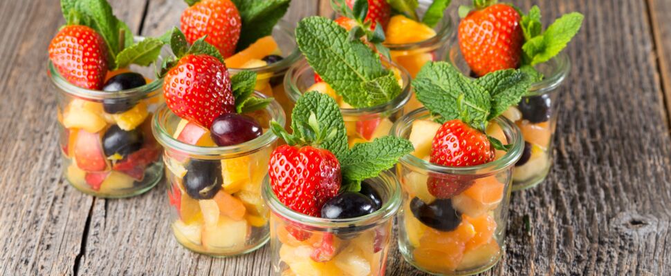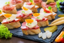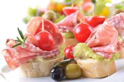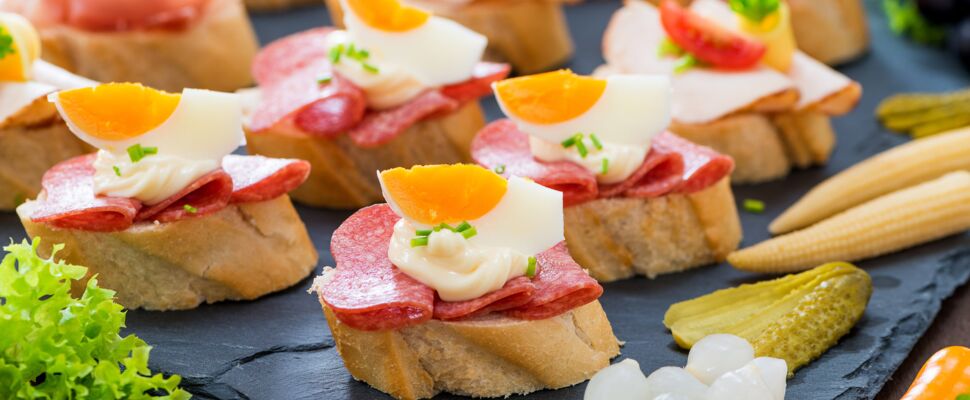 Antipasti, Käse- und Gemüseauswahl, Fischhäppchen, herzhaftes Blätterteiggebäck, Salate (zum Beispiel frischer Balkansalat), Obstsalat mit Creme, Obstspieße – und Obstvariationen.