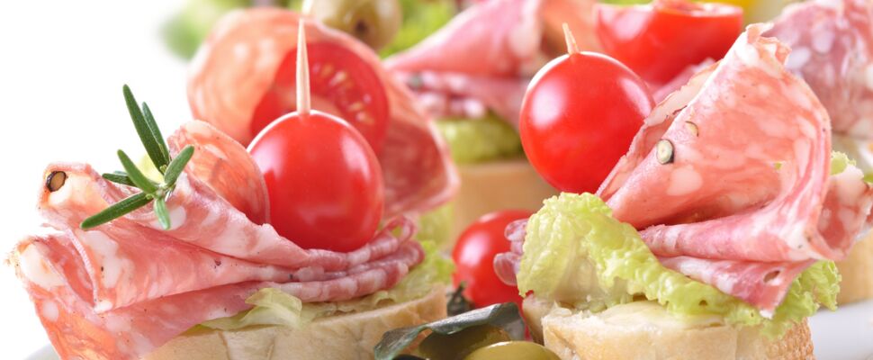 Antipasti, Käse- und Gemüseauswahl, Fischhäppchen, herzhaftes Blätterteiggebäck, Salate (zum Beispiel frischer Balkansalat), Obstsalat mit Creme, Obstspieße – und Obstvariationen.